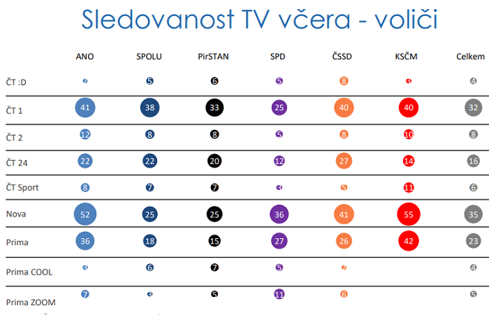 Data ukazují, že sledovanost stanice ČT1 převládá u voličů koalic Spolu a PirSTAN a také, že tito voliči po TV Nova jako třetí stanici sledují ČT24. Voliči ANO, SPD a KSČM nejčastěji sledují TV Nova a s výjimkou voličů ANO má u nich druhé nejvyšší zastoupení TV Prima. ČT1 je u nich v pořadí třetí stanicí. Voliči ČSSD mají rovnoměrně silné zastoupení mezi TV Nova a ČT1.