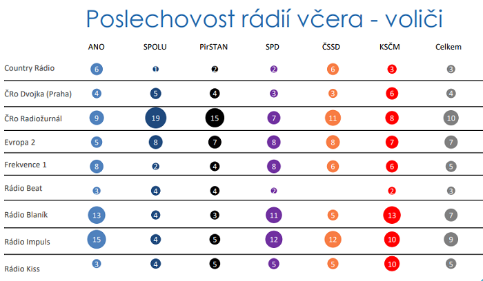 Voliči koalic Spolu a PirSTan také s odstupem nejčastěji poslouchají stanici Český rozhlas Radiožurnál. Druhou nejčastější volbou je u nich Evropa 2. Voliči ANO upřednostňují Rádio Impuls, druhou volbou je potom Rádio Blaník. Rádia Impuls a Blaník jsou nejposlouchanější i mezi voliči SPD. Platí to i pro voliče KSČM, u kterých je nejsilnější Blaník před Impulsem a rádiem Kiss. Voliči ČSSD poslouchají nejčastěji Impuls a Radiožurnál.