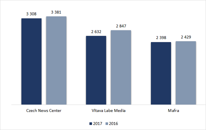 Pozici trojky upevnila mediální skupina Mafra. Čtenost jejích titulů se v loňském roce vyvíjela ve srovnání s rokem 2016 nejstabilněji. Celková čtenost skupiny, do níž patří mj. deníky MF Dnes a Lidové noviny, představovala 2,398 mil. čtenářů (-1,3 %). Tímto výsledkem stáhla náskok druhé VLM.