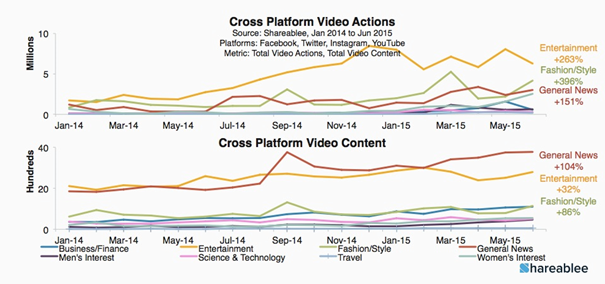 Dalším trendem, který se v mediální branži v roce 2015 v sociálních médiích výrazně projevuje, je nárůst uživatelské aktivity u videoobsahu. Ta v prvním pololetí stoupla o 255 % proti stejnému období roku 2014. Tento nárůst je tažen sociálními interakcemi na Facebooku (+168 %), Twitteru (+154 %) a v první řadě opět na Instagramu (+622 %). Na samotném YouTube sociální interakce vzrostly „jen“ o 41 procent. Aktivita uživatelů roste napříč tematickým zaměřením médií, nejvíc však u zábavních médií a v kategorii „Fashion & Style”.