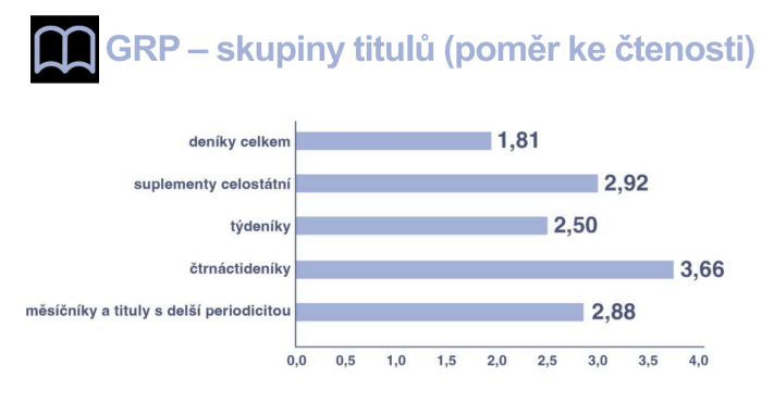 GRP je pak možné spočítat pro jednotlivé tituly i skupiny titulů a vyjádřit tím tak poměr k celkové čtenosti na vydání.