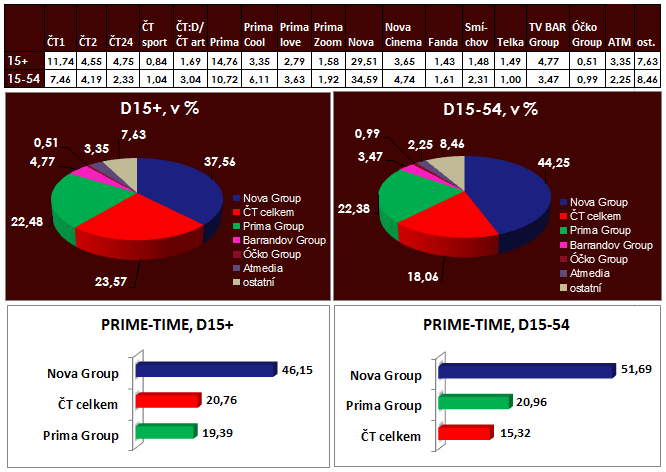 Reality show Výměna manželek (Nova) jasně ovládla středeční večer. V průměru pořad zhlédlo 1,57 mil. diváků starších 15 let (podíl 42 %), což byl trojnásobek druhého nejúspěšnějšího středečního večerního pořadu. Ještě lépe si pořad vedl v mladší skupině 15-54 (podíl 52 %). To se odrazilo i na podílu skupiny Nova v hlavním vysílacím čase, kde v této cílové skupině přesáhla 50 %.