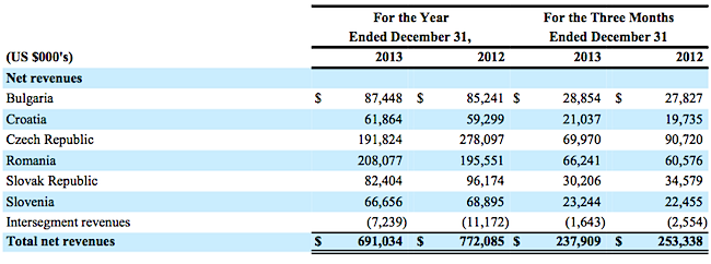 V České republice loni firma zaznamenala propad výnosů o zhruba 30 procent na 191,8 milionu dolarů (cca 3,7 mld. Kč). Meziroční snížení výnosů tak kvůli nepřijetí loňské obchodní politiky představuje cca 1,7 mld. Kč. Provozní výsledek OIBDA, který nezahrnuje odpisy majetku a ztráty se snížením hodnoty aktiv, spadl na českém trhu do ztráty 11,3 milionu dolarů (cca 220 mil. Kč) po zisku 106,3 milionu USD v předchozím roce. Na výsledku se podle dřívějších vyjádření společnosti podepsala mimo jiné nová obchodní politika na českém trhu.