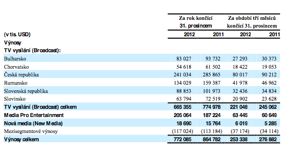 Výnosy CME se loni celkově v meziročním srovnání snížily o 11 %, a to především kvůli poklesu výnosů ze své největší části podnikání – z televizního vysílání. Pokles reklamního trhu a ekonomické faktory se odrazily na tom, že výnosy z televizního vysílání celkově meziročně klesly o 14 %. Naopak výnosy zvýšily divize Media Pro (výroba programu) o 10 % a divize Nová média o 19 %.