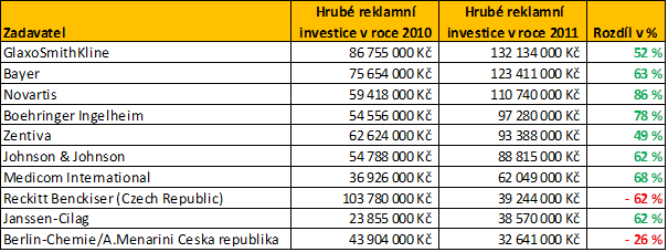 Tuzemské firmy zaměřené na výrobu léčiv v roce 2011 razantně zvýšily nákup reklamy v ceníkových cenách. Podle monitoringu reklamních investic společnosti Admosphere letos prozatím nejvíce investují firmy GlaxoSmithKline, Bayer a Novartis. Uvolnění rozpočtů se projevuje i v propagaci jednotlivých firemních značek. Na zviditelnění některých z nich padají dvojnásobné a vyšší částky než vloni.S mediatypy subjekty raději moc neexperimentují a své kampaně staví hlavně na televizní komunikaci.