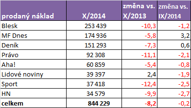 Průměrný souhrnný prodaný náklad tuzemských deníků dosáhl v letošním říjnu podle dat ABC ČR 844 tisíc výtisků, což bylo o 8 % méně než v říjnu loňského roku. Ve srovnání s předešlým měsícem zářím byl ale celkový prodaný náklad na zhruba stejné úrovni.