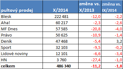 Celkový vývoj v prodaném nákladu deníků se tak nemění: 8% meziroční pokles je v souladu s dosavadním vývojem. Rychleji přitom klesá pultový prodej (meziročně -11 %). Deníkům tak pomáhají především elektronické verze, které celkový výsledek zlepšují.