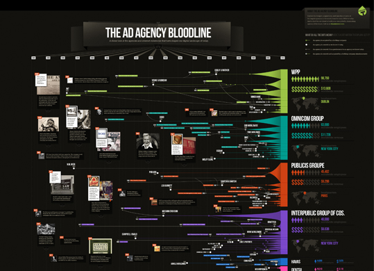 Skvělá infografika se podařila společnostem Aquent a The Barbarian Group, které v jednom obraze ztvárnily vše podstatné z dvousetletého vývoje reklamy, reklamních a mediálních agentur a nástupu digitálních médií.