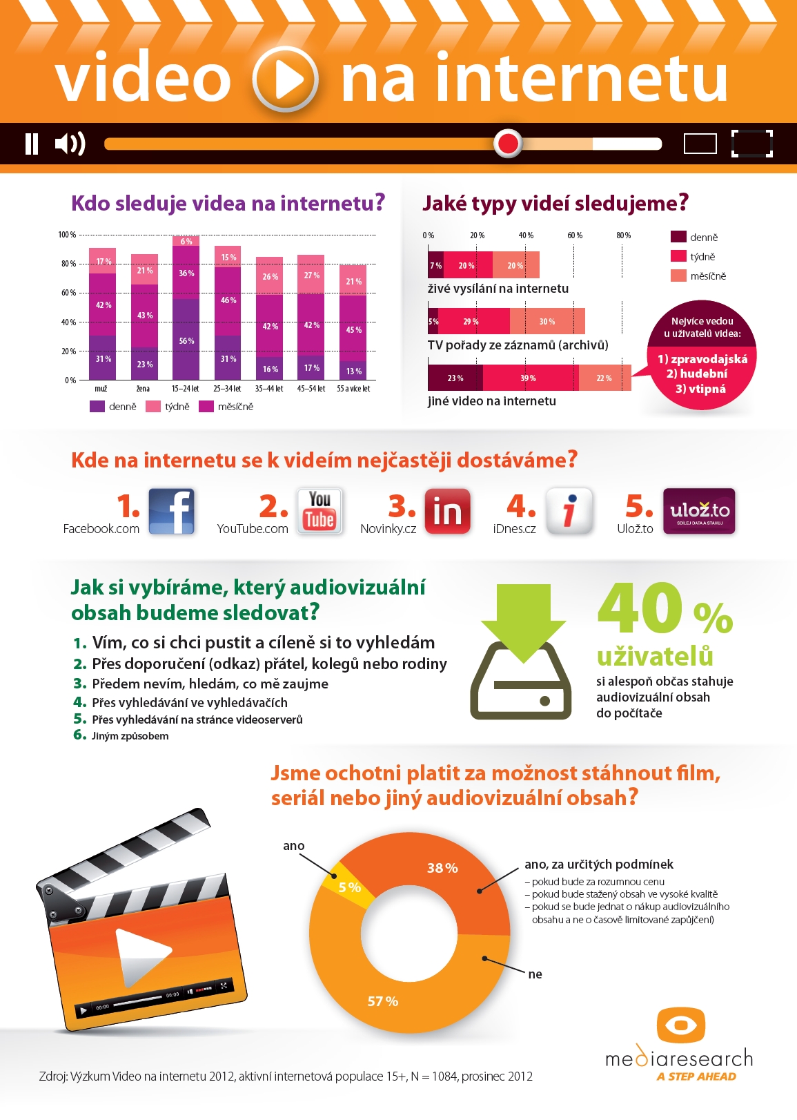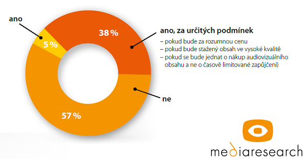 Více než polovina českých uživatelů internetu není ochotná platit za online sledování nebo stahování audiovizuálních obsahů (filmů, pořadů z internetových archivů, hudebních klipů a podobně). Dalších 38 % respondentů pak uvádí, že by za takový obsah platili pouze za jistých podmínek – a nejčastěji by rozhodovala cena. Výsledky vyplývají z aktuálního výzkumu společnosti Mediaresearch, realizátora českého peoplemetrového projektu.