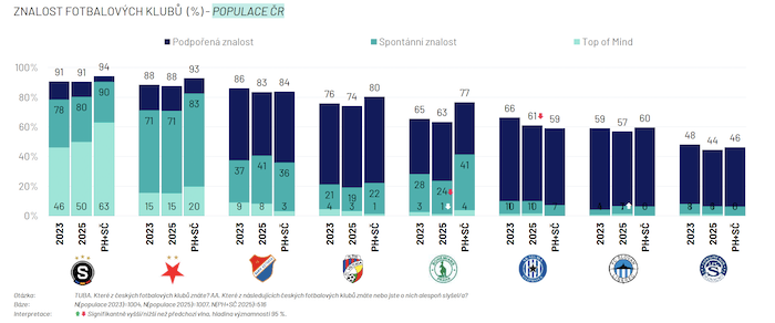 Mezi fotbalovými kluby dominuje ve všech typech znalosti AC Sparta Praha. Jako první ji zmínila až polovina Čechů, spontánně ji zná 80 % populace, podpořeně 91 %. Na úrovni národní populace jí konkuruje jen SK Slavia Praha.