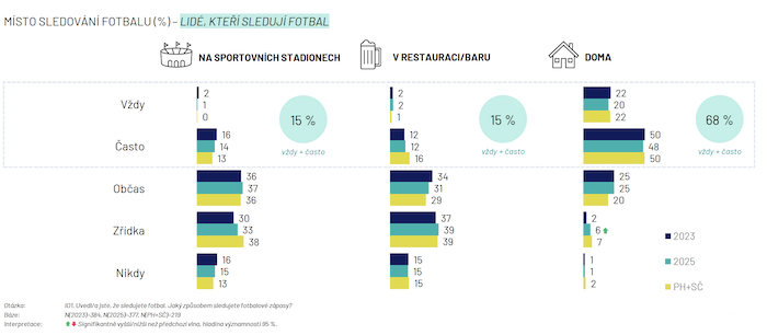 V domácím prostředí sleduje fotbal 68 % respondentů, zatímco na stadionech či v restauracích je to shodně 15 %. Popularita sledování fotbalu je o něco vyšší v Praze a Středočeském kraji, než je celorepublikový průměr.