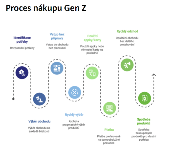 Až 68 % mladších respondentů přiznalo, že nakupuje impulzivně alespoň jednou týdně – často „po cestě“, bez plánu a s mobilní aplikací v ruce. U střední generace to platí jen pro 35 %. Naopak 73 % střední generace dělá velké plánované nákupy, často pro celou rodinu, zatímco u Gen Z je to 42 %.