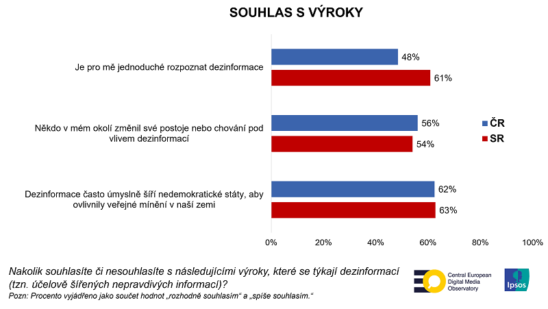 Téměř dvě třetiny populací obou zemí shodně souhlasí s tím, že dezinformace často úmyslně šíří nedemokratické státy, aby ovlivnily veřejné mínění v naší zemi. Více než polovina lidí pak souhlasí s tím, že někdo v jejich okolích změnil své postoje nebo chování pod vlivem dezinformací. Méně Čechů (48 %) než Slováků (61 %) uvádí, že je pro ně jednoduché rozpoznat dezinformaci.