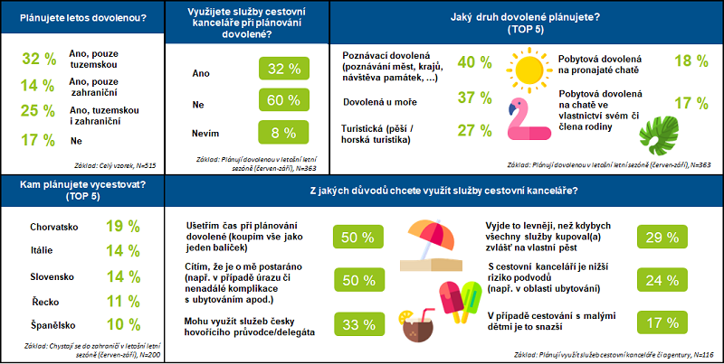 Z výzkumu dále vyplynulo, že 70 % respondentů plánuje v letošní letní sezóně alespoň třídenní dovolenou. Třetina plánuje pouze tuzemskou rekreaci a 14 % pouze dovolenou v zahraničí. Čtvrtina dotázaných chce rozdělit svůj volný čas mezi Česko a zahraniční destinaci. Rozhodnutí, zda změní své obvyklé prostředí, zatím neučinilo 13 % respondentů a 17 % dovolenou neplánuje.