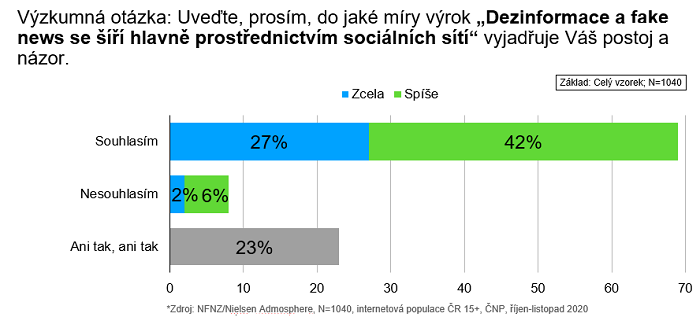 Počet lidí, kteří se setkali s dezinformacemi a fake news, roste. S obsahem, který považovali za fake news nebo za dezinformaci, se již někdy setkalo 66 % české internetové veřejnosti, což je o 11 procentních bodů více než v roce 2019. Vyplývá to z výsledků studie Zpravodajství v digitálním věku 2020, části zaměřené na šíření dezinformací, na které druhým rokem spolupracoval Nadační fond nezávislé žurnalistiky (NFNZ) s výzkumnou agenturou Nielsen Admosphere. Zúčastnilo se jí 1040 respondentů internetové populace starší 15 let.