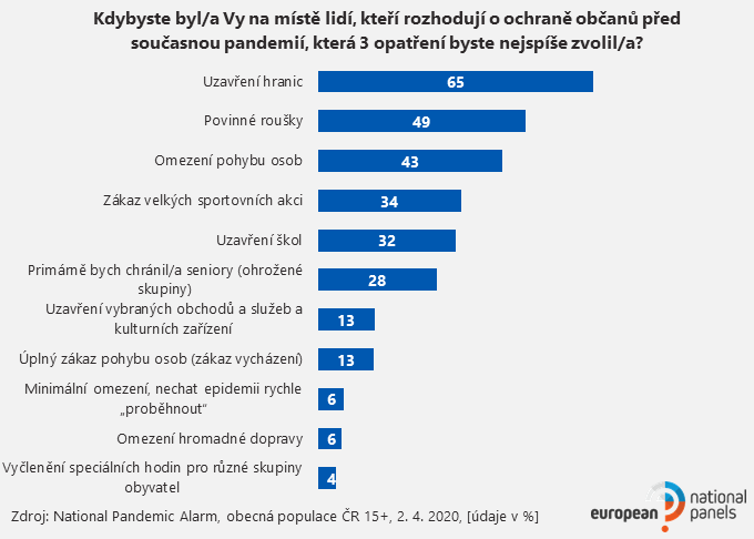 Pokud by si lidé měli vybrat, která tři opatření zavedou, dvě třetiny by zavedly uzavření hranic, polovina povinné nošení roušek a 43 % by omezilo pohyb osob. Pro zákaz velkých sportovních akcí či uzavření škol by se rozhodla třetina. Mezi lidmi do 44 let by pětina byla pro úplný zákaz vycházení, lidé nad 60 let výrazněji podporují uzavření hranic (69 %) či nošení roušek (55 %).