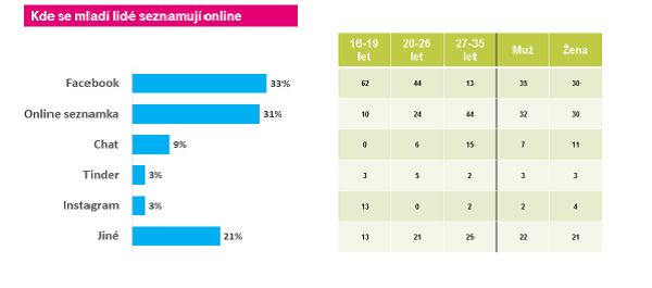 Nejvýraznějším prostředkem k seznamování je sociální síť Facebook, kterou využívají zejména teenageři. Následuje online seznamka, která se těší oblibě u starších respondentů ve věku 27 až 35 let. Naopak seznamovací aplikace typu Tinder jsou u mladých Čechů na okraji zájmu.