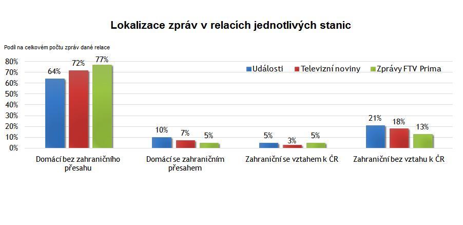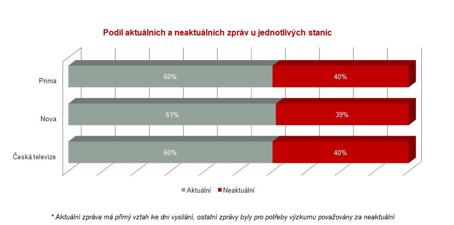 Zjistili například, že zhruba 40 % analyzovaných zpráv všech tří stanic nemělo přímý vztah ke dni vysílání – to svědčí o faktu, že zpravodajskou relaci je potřeba naplnit i v případě, že se v daný den nestalo dost „zajímavých“ událostí, a v tom případě poslouží i různé předtočené zprávy. Výzkumníci také dospěli k závěru, že tematické složení zpráv na Primě se z více než 50 % skládalo ze zpráv věnovaných kriminalitě a nehodám a z upoutávek na další pořady a VIP či Krimi zprávy. Předvídatelně naopak dopadla analýza Událostí České televize, jež se výrazně více než komerční stanice věnovaly zahraničním událostem a zprávám z oblasti české politické scény, ekonomiky i mezinárodnímu dění.