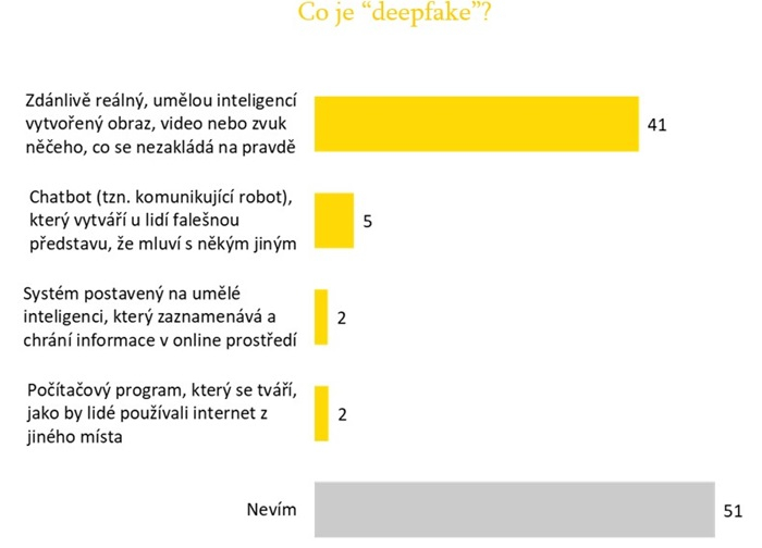 U otázky zjišťující znalost „deepfake“ zvolilo jednu správnou odpověď ze čtyř nabízených pouze 41 % respondentů. Více než polovina jich uvedla, že neví, a zbývající desetina označila špatnou odpověď. Současně více než třetina lidí (35 %) uvedla, že se s deepfake obsahem v posledních měsících setkala.