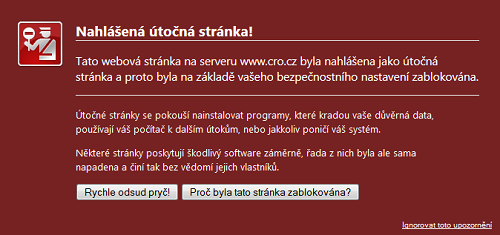 Webové stránky Českého rozhlasu jsou od úterního večera částečně nedostupné. Příčinou je hromadné hlášení závadnosti stránek Českého rozhlasu. Toto hlášení se automaticky předává do mezinárodních databází, z nichž čerpají internetové prohlížeče a antivirové programy. V důsledku toho se běžní uživatelé nemohou na stránky ČRo dostat.