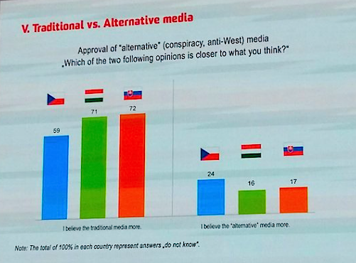 V současnosti důvěřuje tradičním médiím v České republice jen 59 % populace, což je o 12 procentních bodů méně než v Maďarsku a o 13 procentních bodů méně než na Slovensku. Ve srovnání s oběma zeměmi má Česko naopak nejvyšší podíl lidí (24 %), kteří důvěřují tzv. alternativním médiím, přinášejícím „tu pravou pravdu“. Vyplývá to z informací, které na středeční konferenci Czech Internet Forum 2016 prezentoval šéfredaktor reportážní publicistiky České televize Marek Wollner.