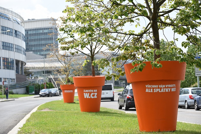 Společnost Wüstenrot v rámci své jarní kampaně na Půjčku ProBydlení, jež nabízí konstantní výši splátek po dobu 22 let, instalovala kolem stromořadí před svou centrálou na Kavčích horách v Praze obří oranžové květináče.