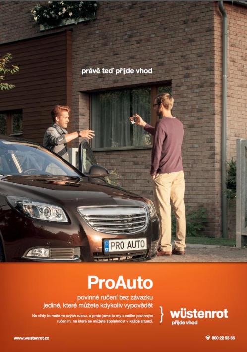 Kampaň ProAuto, která startuje 17. září, představuje v kompletním mediamixu aktuální novinky povinného ručení. Jde především o změnu nárůstu bonusu za bezeškodní průběh a možnost nově uzavřenou smlouvu kdykoli vypovědět. Jak uvedla Ivana Kryglová, ředitelka marketingu společnosti Wüstenrot: „Náš produkt tentokrát cílí na řidiče, kteří už za dva roky jízdy bez nehod od nás dostanou bonus ve výši 30 %, maximálně pak mohou dosáhnout až na 60% slevu.“