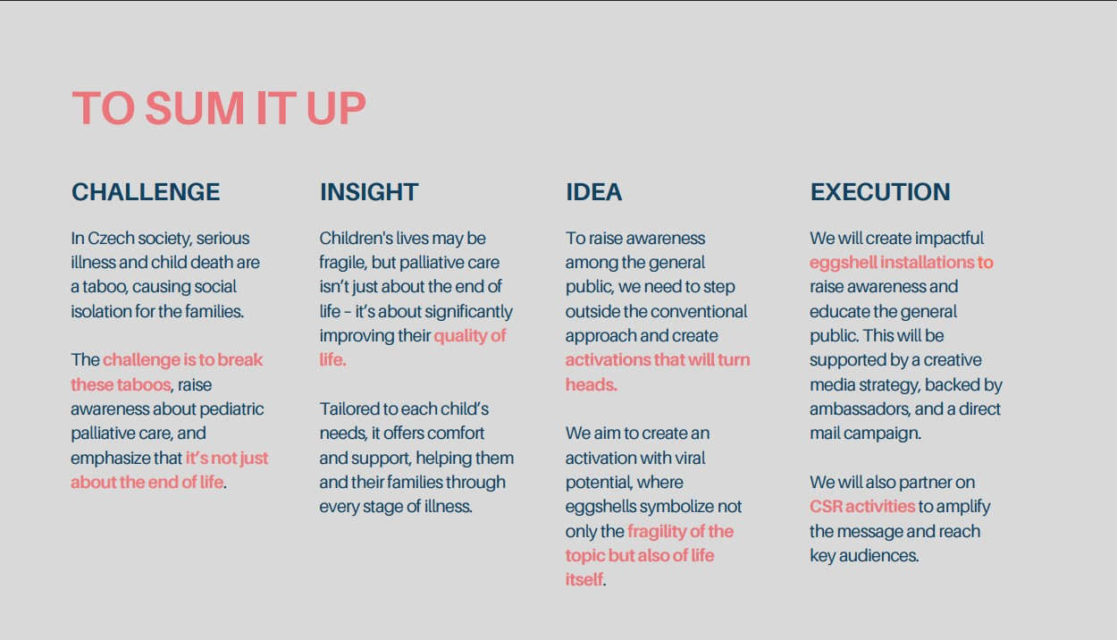 Soutěžící měli navrhnout PR kampaň, která pomůže překonat tabu spojená s dětskou paliativní péčí a zvýší povědomí o její komplexnosti. Kampaň měla oslovit širokou veřejnost, novináře, tvůrce obsahu i politiky a upozornit na nutnost dostupné a variabilní péče napříč regiony ČR. Návrh je připravován pro organizace Česká společnost paliativní medicíny a Pallium.