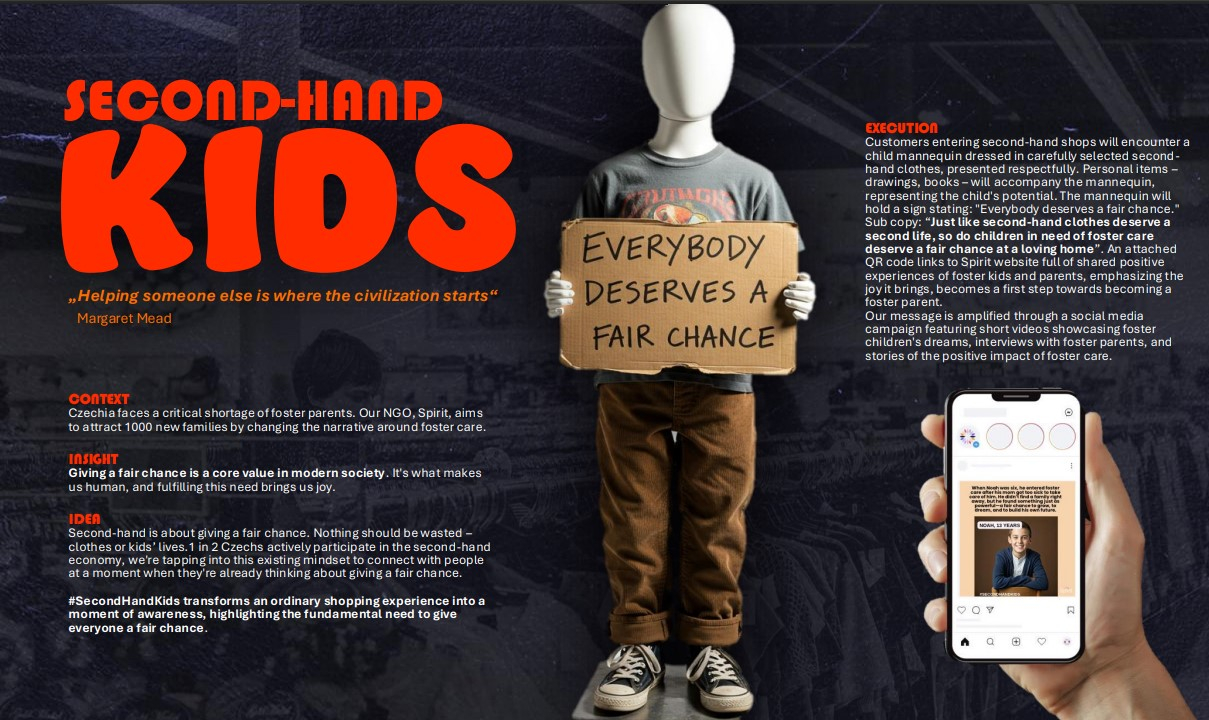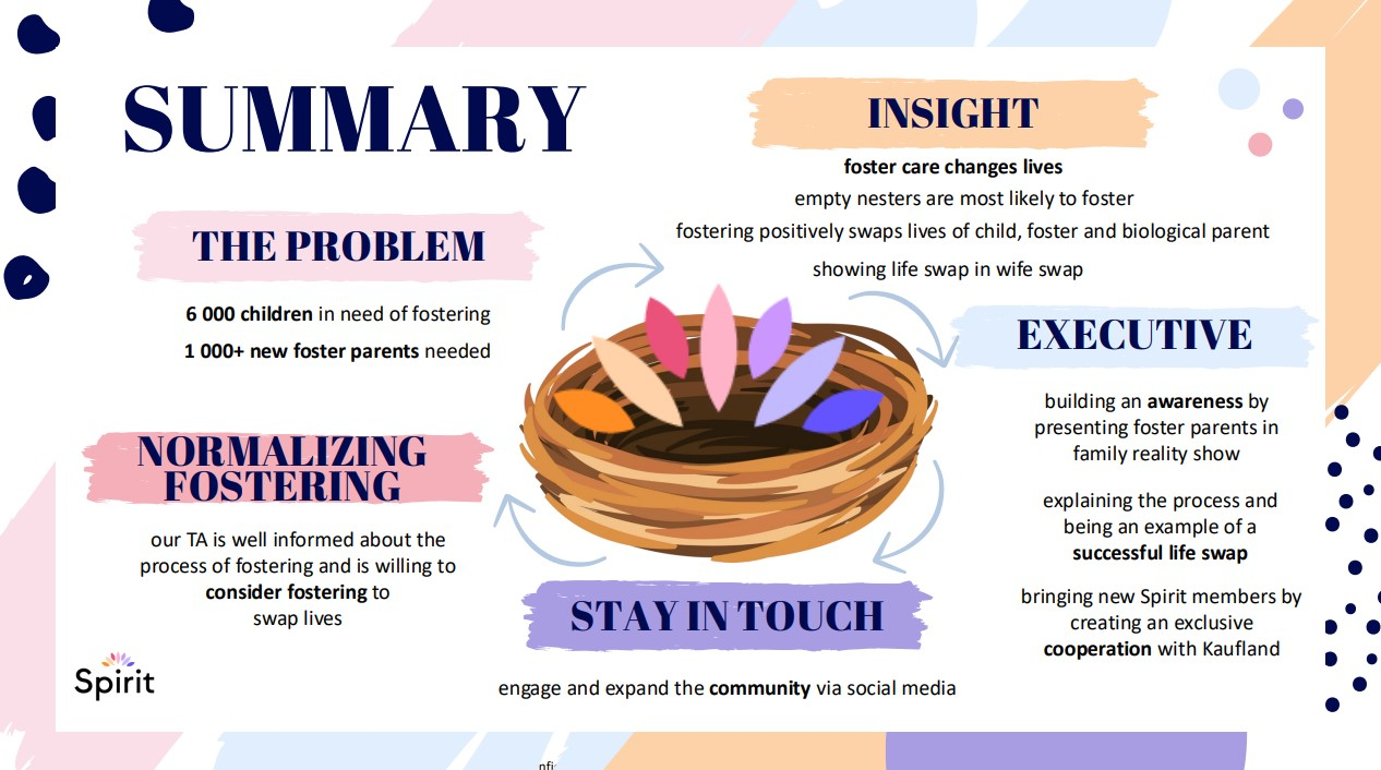Soutěžící měli navrhnout kampaň, která osloví veřejnost a motivuje 1000 nových rodin k pěstounství. Kampaň měla zvýšit povědomí o pěstounské péči, získat 100 tisíc pravidelných sledujících a přivést 1500 vážných zájemců do pěstounského klubu. Návrh je připravován pro organizaci Spirit, která podporuje pěstounství a usiluje o to, aby žádné dítě nemuselo vyrůstat v ústavu.