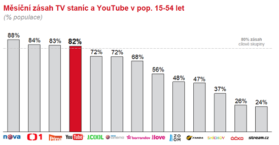 V cílové skupině 15-54 má YouTube zásah více než 80 %, podobně jako Nova, ČT 1 a Prima.