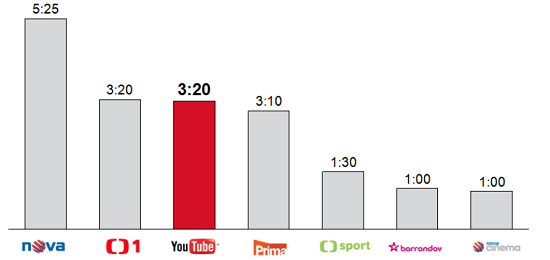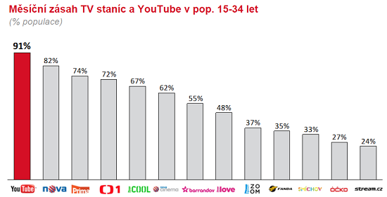 Zásah ve skupině mezi 15 a 34 lety se u YouTube má pohybovat kolem 91 procent, Nova má 82 procent a Prima 74 procent. Sledováním YouTube tráví lidé týdně podobně času jako u největších českých TV kanálů ČT1 nebo Prima, přičemž nárůst zhlédnutí je tažený zejména mobilními telefony.