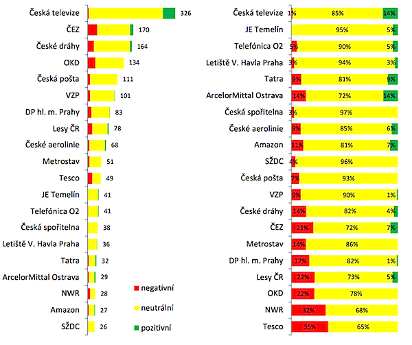Pozn.: Firmy v pravém grafu jsou řazeny podle rozdílu mezi podílem pozitivních a negativních výpovědí od nejpříznivěji hodnocených po nejméně příznivě hodnocené