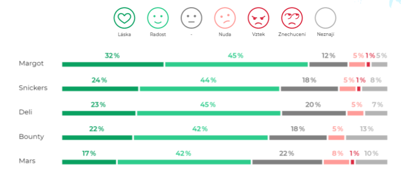 Emoce je jemnější ukazatel (prediktor) skutečného chování zákazníků. Lidé, kteří mají ke značce silnou pozitivní emoci, ji v nákupní situaci pravděpodobně zvolí. Margot má rádo 77 % Čechů, což je nejvíc ze srovnávaných značek. Následují Snickers a Deli, obě sladkosti shodně s 68 %.