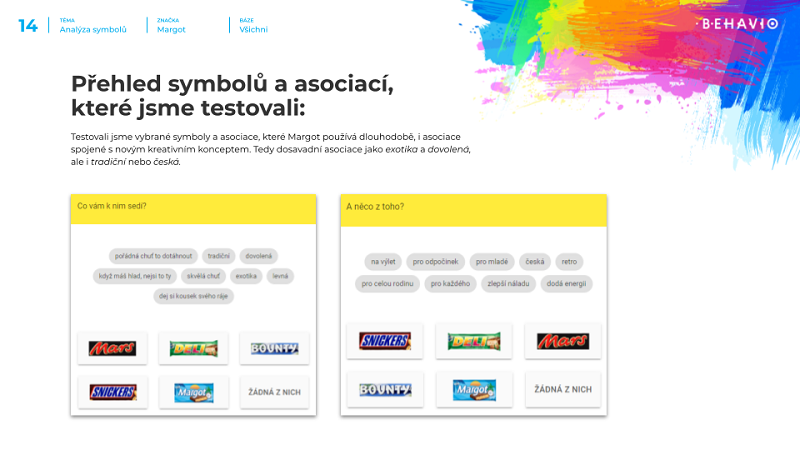 Margot má také vybudované pevné spojení s příležitostmi dovolená a exotika – ty lidé automaticky přiřazují k Margot a nepletou se jim s konkurencí. Na základě dat ale můžeme říct, že značka Margot už získala ze spojení s dovolenou maximum a její síla díky této příležitosti už příliš neporoste. Další kampaň se stávajícími symboly zvýší salienci u současných klientů, ale pravděpodobně neosloví další.