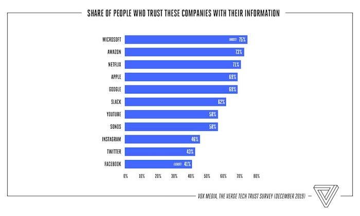 Největší důvěře se však těší Microsoft (71 %), nejmenší Facebook (41 %), u kterého je až 72 % dotázaných přesvědčeno, že drží v rukách až příliš moci.