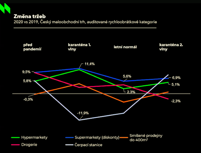 Mezi kamennými obchody se nejlépe dařilo supermarketům a diskontním prodejnám s meziročním růstem tržeb o 8 %, kde nedošlo k tak výraznému poklesu počtu zákazníků jako u jiných typů prodejen. Drogistické řetězce rostly méně, konkrétně o 2 %, protože řada zákazníků upřednostňovala jeden velký nákup a drogistické produkty kupovali v obchodech spolu s potravinami. Nejvíce, o 2 %, poklesly tržby potravin na čerpacích stanicích, které trpěly sníženou mobilitou obyvatel. Ale i zde byly patrné nárůsty tržeb v obdobích, kdy došlo k omezení nedělního prodeje u ostatních typů prodejen.
