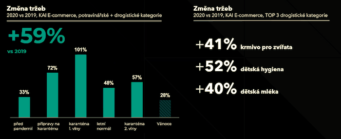 „Pandemie současně přinesla silný nárůst oblasti online prodejů, kde meziroční růst tržeb vystřelil o polovinu,“ připomněl Tomáš Prouza. Meziročně vzrostly tržby e-commerce o 59 %, přičemž nejvíce růst akceleroval během první jarní vlny loňského roku.