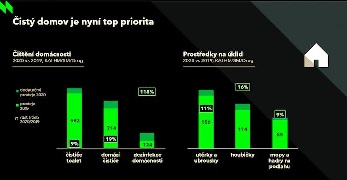 Zároveň rostla potřeba udržovat domácnost v čistotě, takže kategorie jako čističe toalet, mopy, čističe na podlahy nebo utěrky zaznamenaly meziroční nárůst o 10–20 %. Nejvíce ale akceleroval růst výrobků zaměřených na dezinfekci domácnosti – ty zvýšily tržby o 118 %.