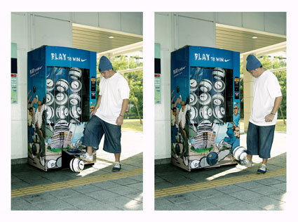 Automaty však lze využít i mnohem jednodušeji – vyměnit obvyklý sortiment za něco nečekaného. V Singapuru se rozhodla společnost Nike pro posílení svého street positioningu značky umístit na ulici automat s fotbalovými míči.