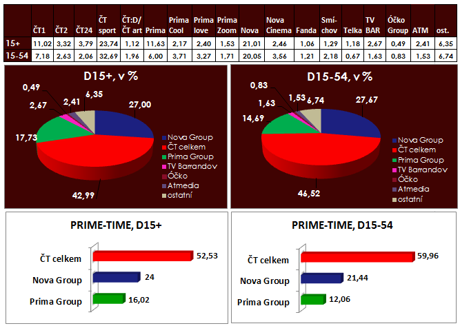 Celodenní podíl ČT sport se v mladší skupině 15-54 dostal přes hranici 30 %. V hlavním vysílacím čase tak kanály České televize v mladší cílové skupině 15-54 opět dosáhly na podíl ve výši 60 %. V širší skupině 15+ zaznamenaly v hlavním vysílacím čase 53% podíl.