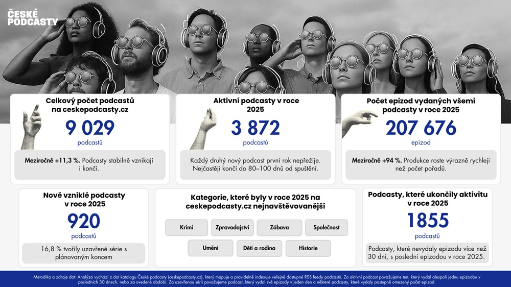 K 1. lednu 2026 eviduje katalog České podcasty celkem 9 029 podcastů. Alespoň jednu epizodu v roce 2025 vydalo 3 872 z nich, přičemž 920 projektů publikovalo poprvé. Zásadní je však zejména růst objemu obsahu. Tvůrci loni zveřejnili 207 676 epizod, což znamená meziroční nárůst o 94,4 %. Produkce tak rostla výrazně rychleji než samotný počet podcastů, což podle autorů analýzy ukazuje posun k intenzivnější práci s již existujícími formáty.