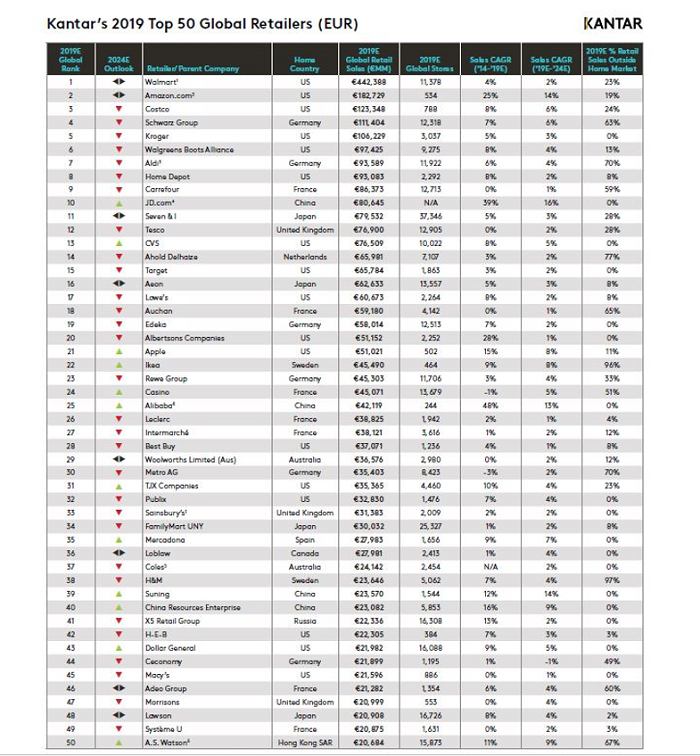 Výzkumná agentura Kantar zveřejnila seznam největších retailerů světa. S očekávaným obratem přes 442 miliard euro v roce 2019 je na prvním místě Walmart jako největší maloobchodní společnost na světě. Je téměř 2,5krát větší než dvojka Amazon, jehož očekávaný obrat je zhruba 183 miliard euro. Šest z deseti největších firem má centrálu v USA. A jen jedna firma je aktivní výhradně v USA – a to Kroger, které v žebříčku náleží páté místo.