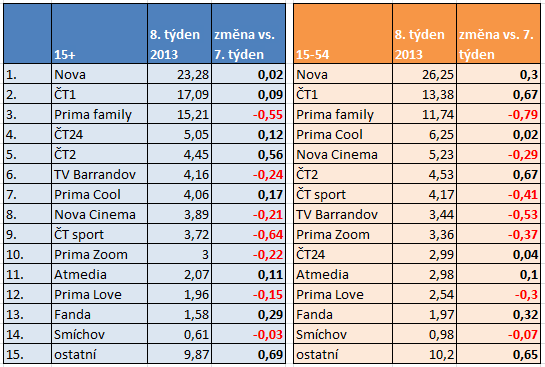 Průměrné podíly TV stanic v osmém letošním týdnu (od 18.2. do 24.2. 2013) ve srovnání s předcházejícím týdnem ukazují, že nejvíce si minulý týden polepšila ČT2, a to v obou cílových skupinách. Naopak v minulém týdnu se snížil podíl sportovního ČT Sport (-0,6) a Prima family o 0,5 procentního bodu (15+) a o 0,8 procentního bodu ve skupině 15-54.