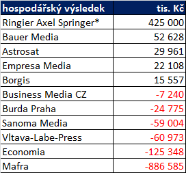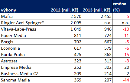 Zhruba polovina z největších tuzemských vydavatelů tisku je podle hospodářských výsledků za rok 2013 ztrátových. Vydavatelé, jejichž výsledek byl v tomto roce kladný, počítají své zisky na úrovni maximálně desítek milionů korun. Výjimkou je vydavatelství Czech News Center (bývalý Ringier Axel Springer), jehož výše zisku byla stále v rovině několika stovek milionů korun. Je tak vydavatelem s nejvyšší mírou zisku na českém trhu.