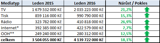 Podle monitoringu investic společnosti Nielsen Admosphere se hrubé výdaje za nákup reklamního prostoru v médiích v prvním letošním měsíci meziročně zvýšily o 18 %. Celkový monitorovaný objem měl dosáhnout 4,14 mld. Kč. Nejvíce k růstu hrubých investic měla přispět rádiová a televizní reklama.