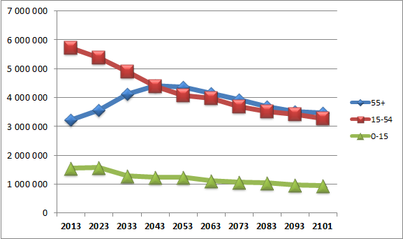 Už za deset let se počet lidí ve skupině 15-54 sníží o 340 tisíc a o téměř stejný počet se rozroste skupina lidí starších 55 let. Za dvacet let už bude počet lidí v obou skupinách téměř vyrovnaný: konkrétně ve skupině obyvatel 15-54 poklesne počet lidí o 820 tisíc, zatímco o 890 tisíc se zvýší počet lidí nad 55 let. Změny v rozložení populace, které se odehrají v následujících 20-30 letech, budou pro její strukuru zásadní a určující. Následný vývoj do roku 2101 se sice ponese ve znamení poklesu populace, ale její struktura se od 30.-40. let příliš měnit nebude.
