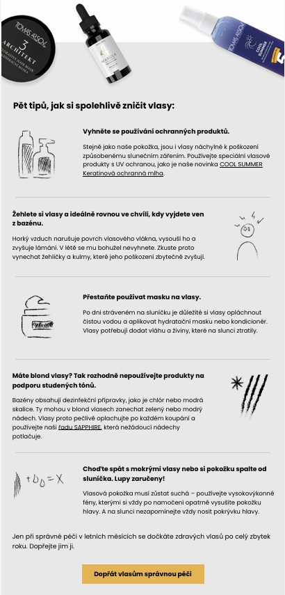 Případová studie české značky vlasové kosmetiky Tomas Arsov ukazuje efektivitu e-mail marketingu. Díky nové strategii a automatizacím dosáhla 58% meziročního růstu tržeb z e-mailingu a 101% nárůstu počtu zakoupených produktů. Jak se z náhodného rozesílání stala promyšlená strategie s ROI 1419 %? „Naše nejlepší kampaň na první pohled nic neprodává,“ shrnuje vlastník značky.