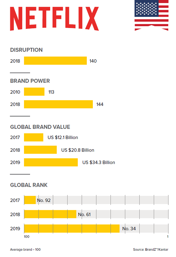 Originálním přístupem k zavedeným pořádkům se vyznačuje například již zmíněný Netflix. V době, kdy byli lidé zvyklí chodit si pro filmy do půjčoven, začal rozesílat DVD poštou v červených obálkách. O deset let později uvedl streamovací službu, kde si každý požadovaný film mohl zhlédnout doma přes internet. A následně začal investovat do vlastního obsahu. I díky svým úspěšným seriálům, jako je House of Cards, Narcos nebo Stranger Things, se posunul za poslední dva roky z 92. příčky na dnešní 32. Jeho aktuální hodnota je vyčíslena na 34,3 mld. USD.
