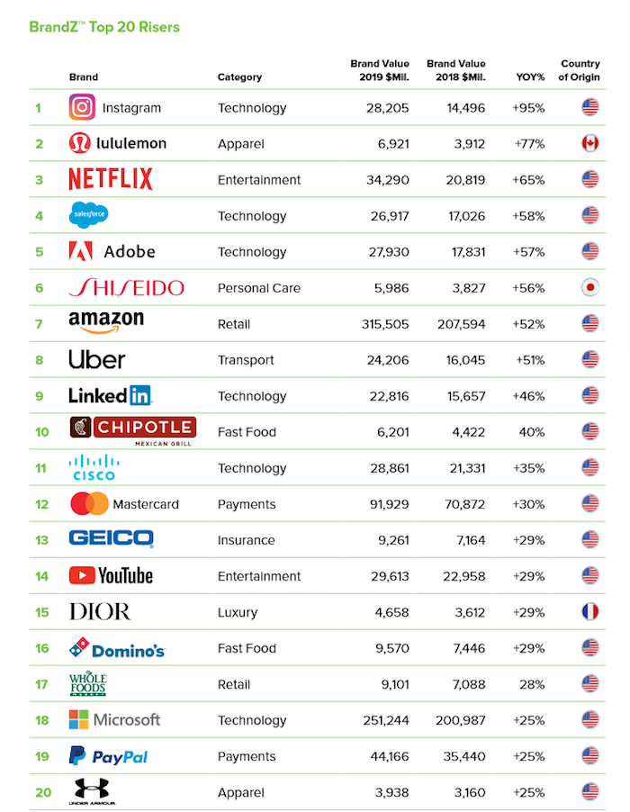 Sociální síť Instagram, založená v roce 2010, letos zdvojnásobila svou hodnotu. Meziročně vzrostla o 95 %, a stala se tak nejrychleji rostoucí značkou žebříčku. Lululemon, značka sportovního oblečení z roku 1998, je druhou nejrychleji rostoucí značkou s meziročním růstem o 77 %. A Netflix, jenž vznikl v roce 1997, svou hodnotu zvýšil o 65 %.