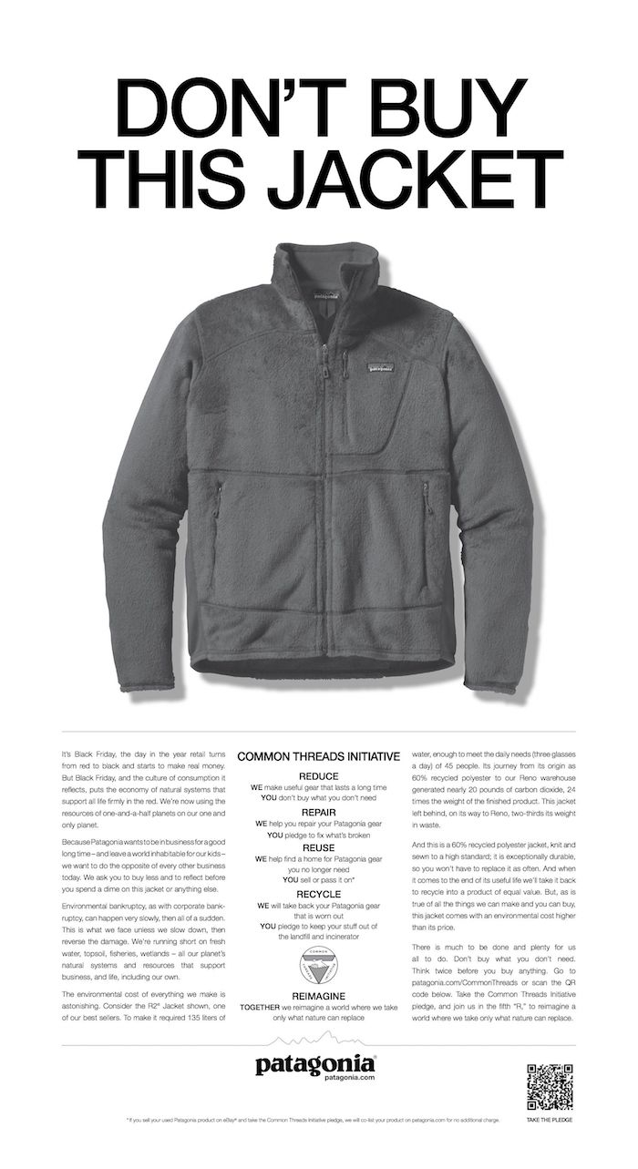 Témata mohou být různorodá, důležité je podle Cheneceyho, aby byla ke značce opravdu relevantní. Outdoorová značka Patagonia se kupříkladu angažuje v ekologických otázkách. Její kampaň se sloganem „Nekupujte si tuhle bundu“ vybízela lidi, aby spíše než nákup nového oblečení uvažovali o opravě či recyklaci staré. „Díky této kampani však Patagonia prodávala více než dřív, protože lidé se chtěli spojit se značkou jako symbolem antikonzumerismu,“ přibližuje Sean Pillot de Chenecey.